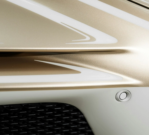 Inspirée du thème « Vagues de Lumière », la carrosserie adopte une séparation visuelle millimétrée. La partie supérieure se pare d’une teinte dorée chaude développée spécialement pour ce projet. En contraste, la partie inférieure s’habille d’un blanc raffiné, profond, subtilement métallisé.